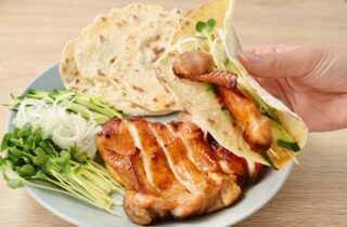 - 焼き上がったら食べやすい大きさにカットし、皮にお好みの野菜と巻いてさらにたれをかけたら完成!