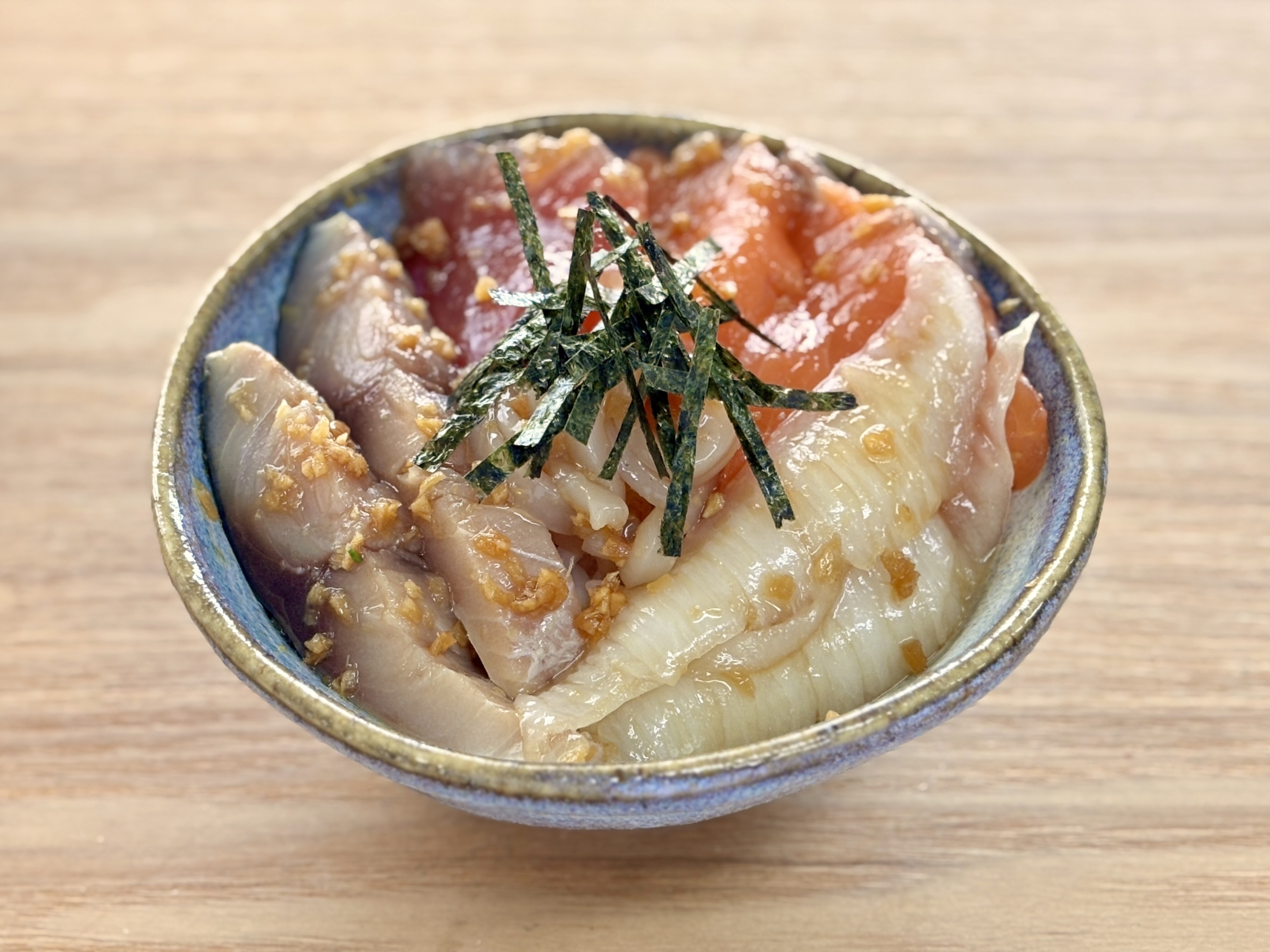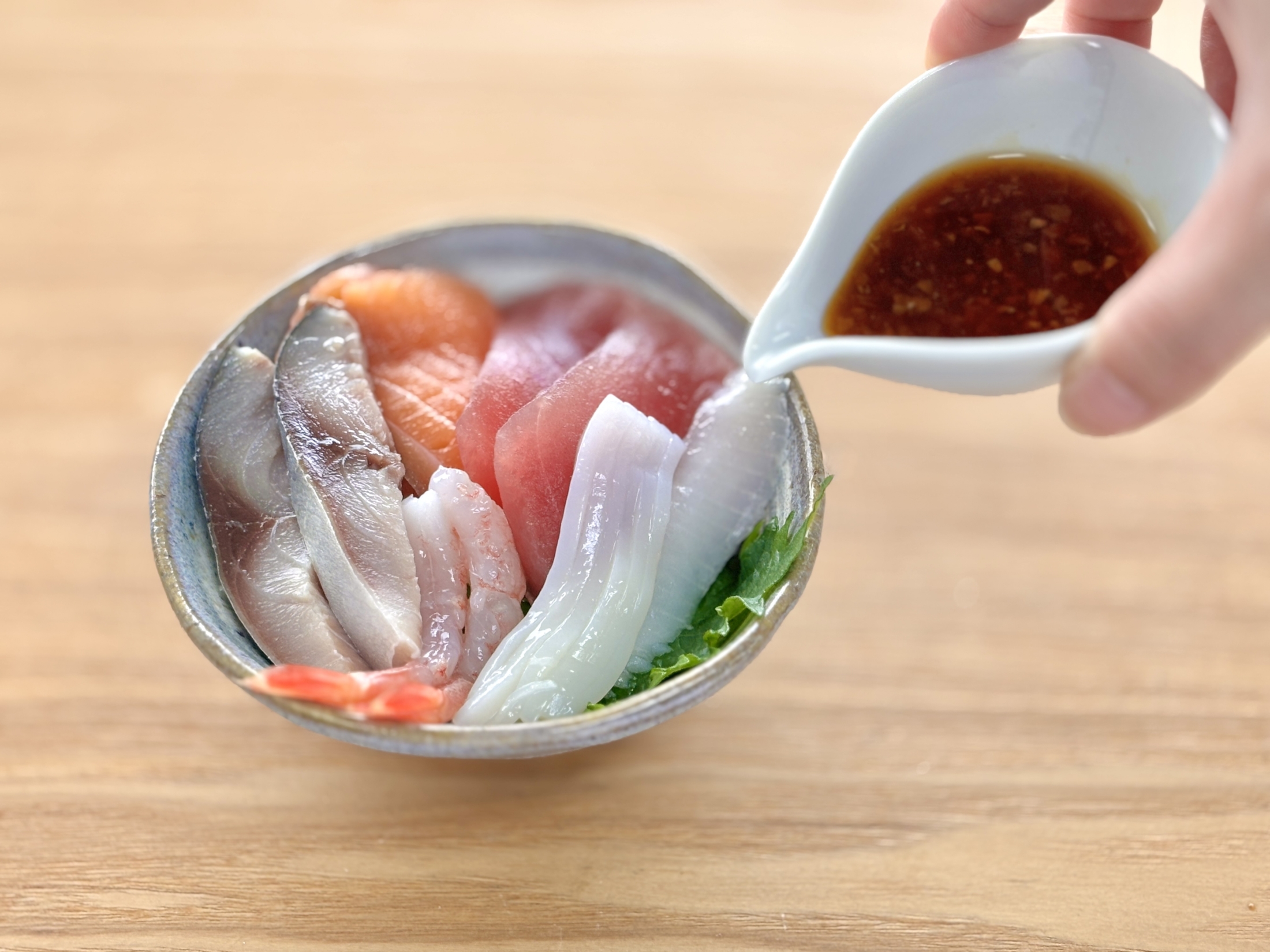 お好みのお刺身を丼に盛り付け、かけるだけ!