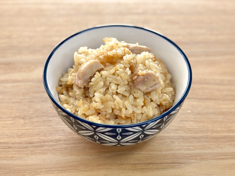 - 炊飯器に洗った米と、目盛りの少し下(1mm位)まで水を入れて、漬け込んだ鶏肉をたれごと上に乗せて通常炊飯したら完成!